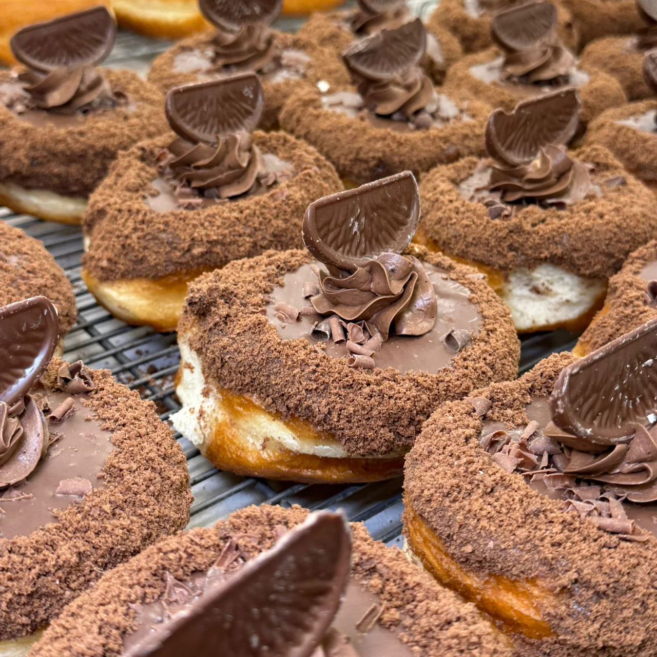 Puddle donut dunked in milk chocolate, topped with chocolate bourbon crumb, orange buttercream, gold glitter, and a slice of Terry’s Chocolate Orange. A Christmas classic done the Doboy way.
