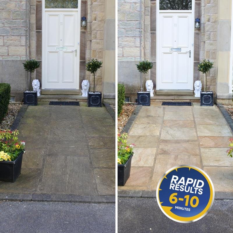 Transform Your Patio in Just 10 Minutes – No Pressure Washer Needed! INSTANT RESULTS: Works in 6-10 minutes (not days, weeks or months like other brands) EASY TO USE: Apply, agitate area with a soft bristle brush, rinse with garden hose. PROFESSIONAL POWER: Removes years of embedded dirt & stains ALL SURFACES: Works on Indian sandstone, block paving, fencing, decking, render & more 5L = 25m² COVERAGE: Ready to use, no mixing required