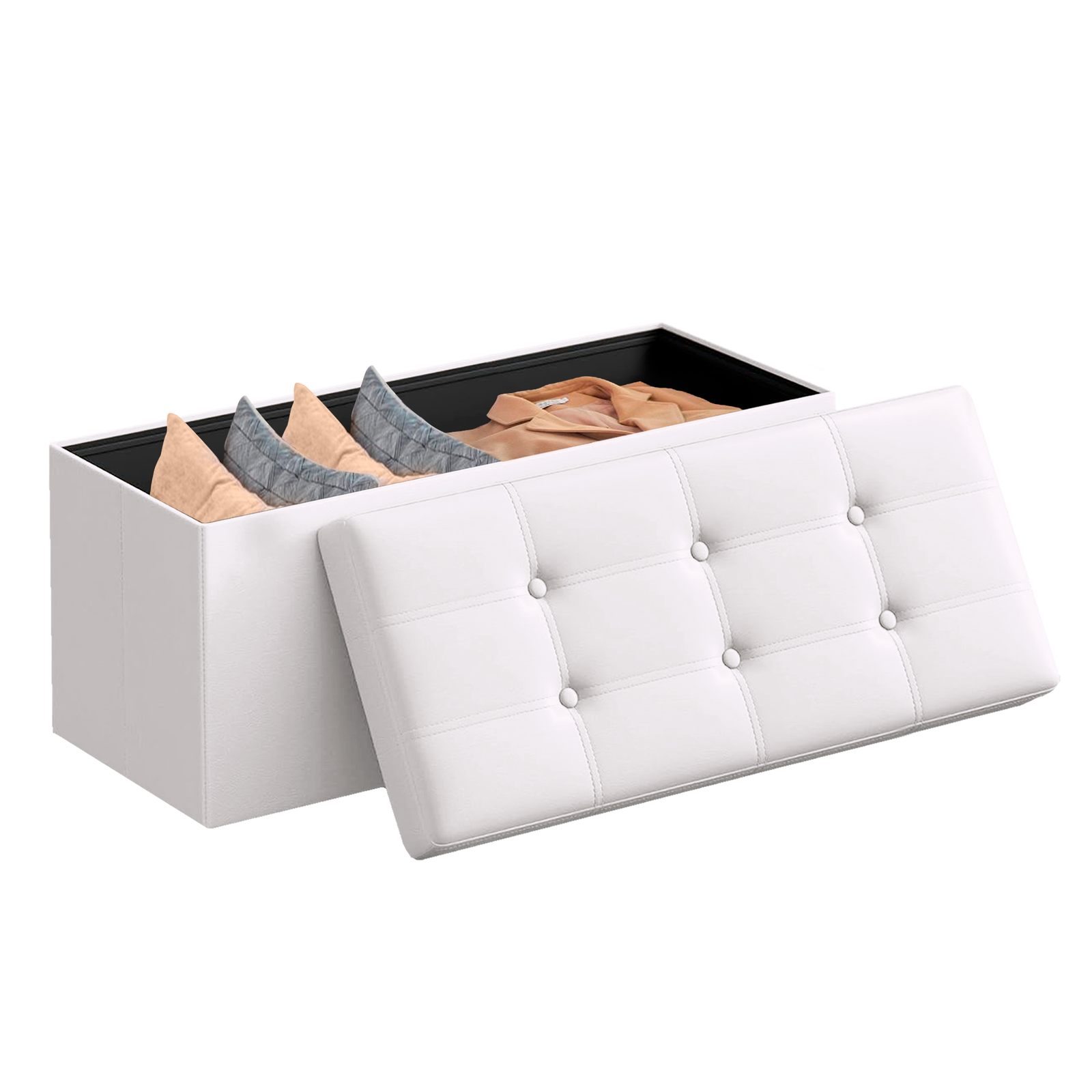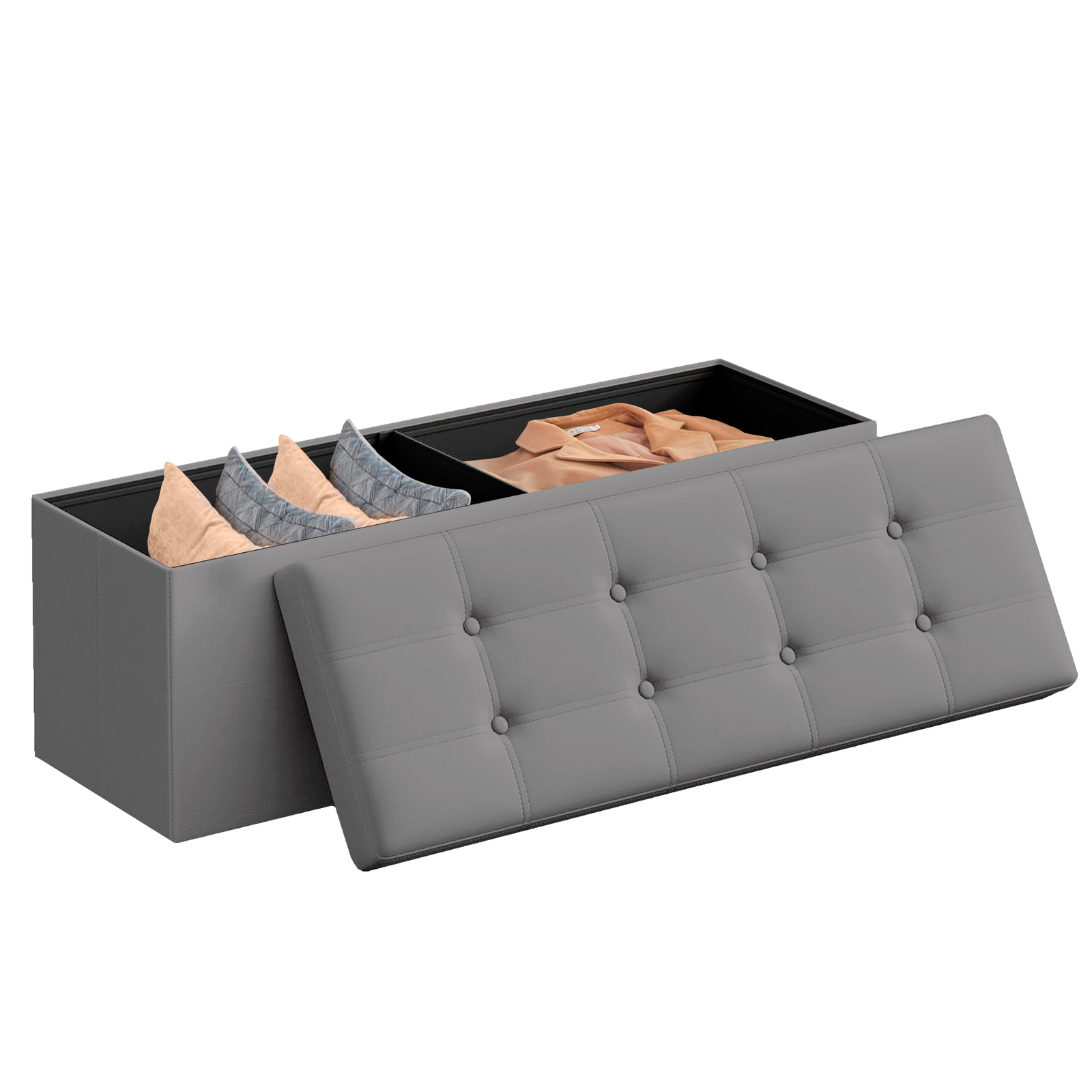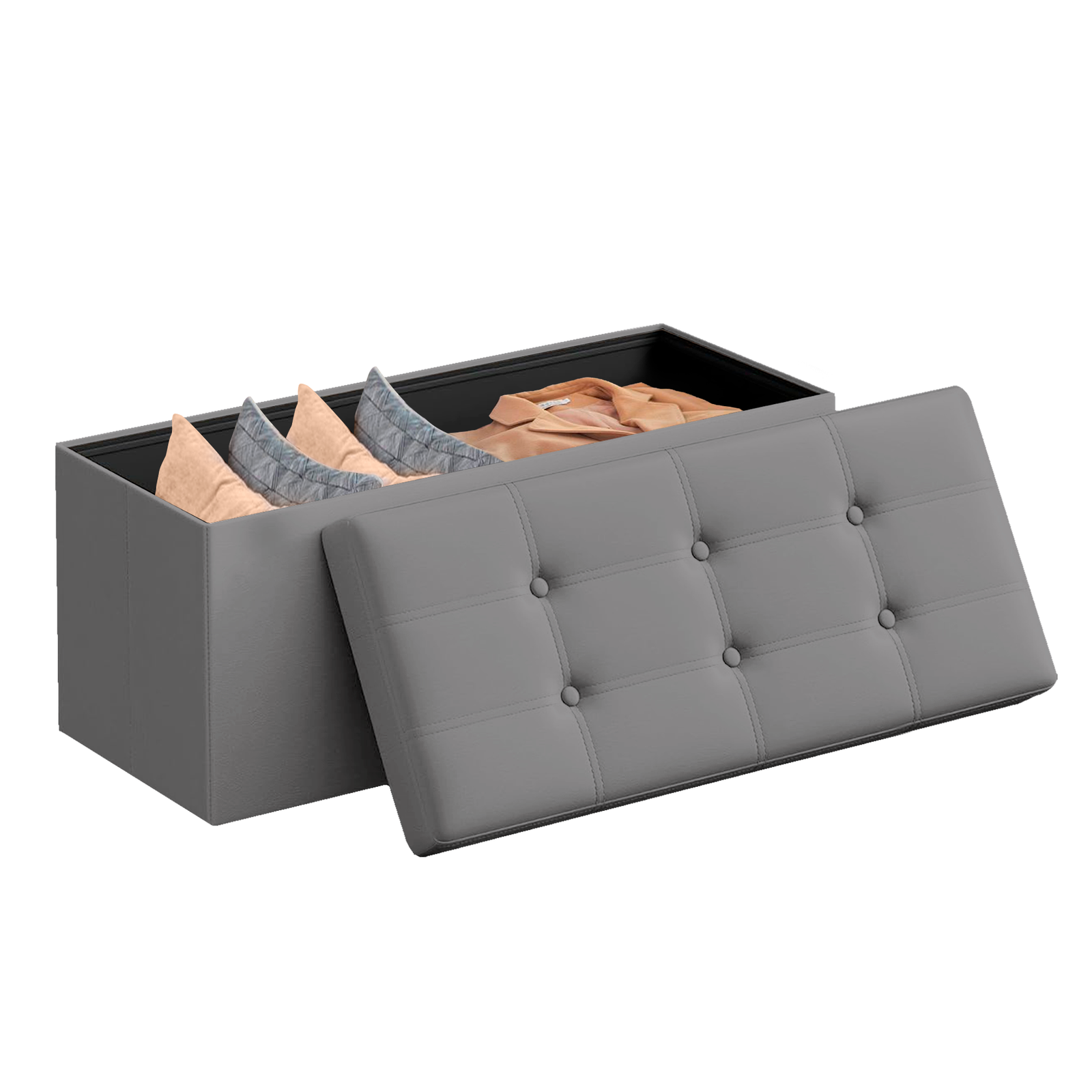 Con una capacidad de 131 L, este puff te ofrece un amplio espacio para organizar tus mantas, libros, ropa o juguetes. Además, su diseño plegable permite guardarlo fácilmente debajo de la cama o en un armario cuando no lo necesites, ahorrando espacio y facilitando su transporte.