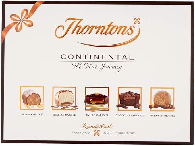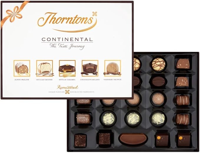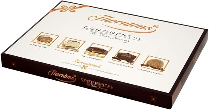 Explore the taste of the continent with our new Continental Gift Collection, offering a delicious selection of Thorntons Continental chocolates. This carefully crafted box of chocolates is perfect to give as a gift to family or friends who are passionate about the finest chocolate. So much goes into Thorntons. This 284g box of chocolates includes a selection of milk, white and dark Thorntons Continental chocolates and is perfectly sized to give as a gift for a loved one. Rediscover the taste of the Swiss Alps with Alpini, tuck into one of our sugar coated Viennese Truffles inspired by the chocolatiers of Vienna, or explore one of our exciting five new flavours such as Salted Caramel Praline or Seville Caramel.